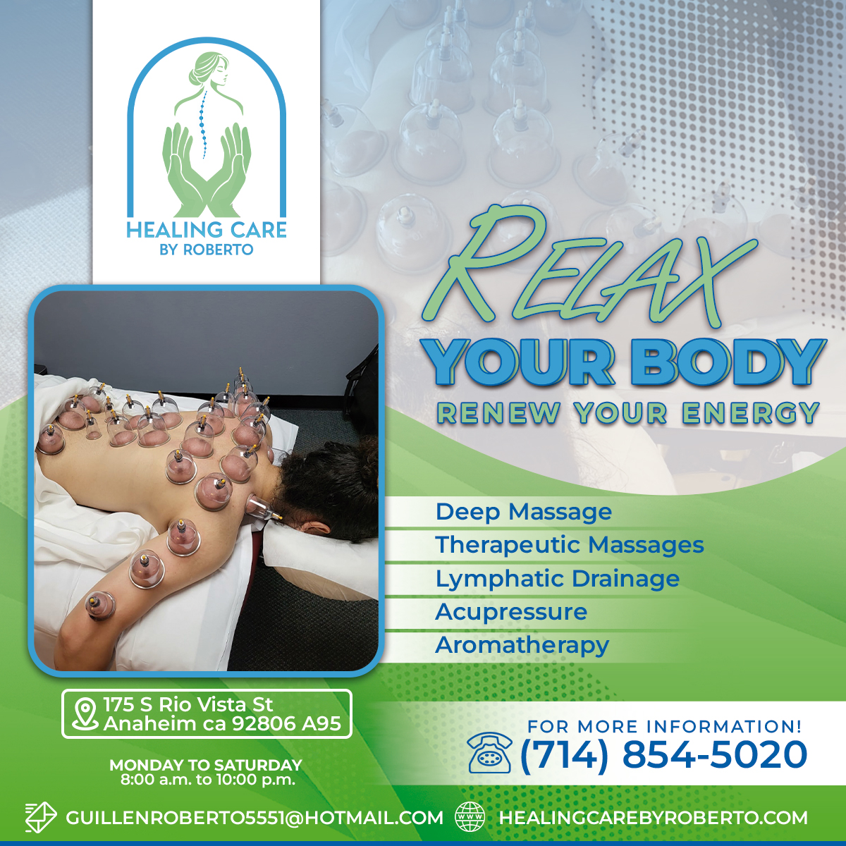 HEALING CARE BY ROBERTO has become a reliable option in Fullerton and neighboring cities, providing therapies such as Deep Massage, Therapeutic Massages, Lymphatic Drainage, Acupressure, and Aromatherapy.